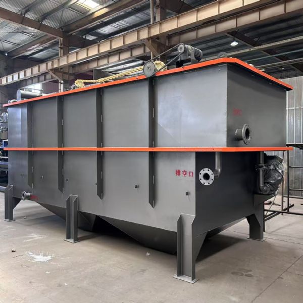 豆制品辣豆干加工废水处理装置预处理阶段格栅与调节池:拦截大颗粒杂质,均化水质水量,削减高峰冲击负荷。气浮沉淀一体机:原理:通过加药(PAC/PAM)使悬浮物絮凝,微气泡粘附絮体上浮,实现固液分离。优势